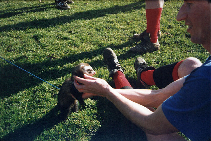 | One of our summer replacement keepers raised ferrets as pets and would bring them to the games at Delta Park for an airing. Here, Glenn Fithian-Barrett foolishly places his fingers near the varmint's mouth. | |