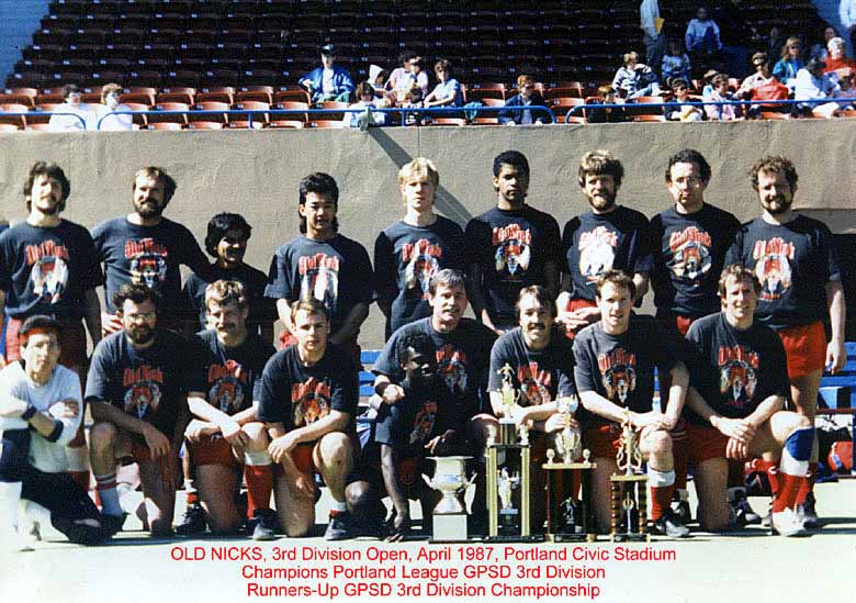 | 1986 - | In 1986/87, the team is Old Nick's/Horsebrass, as the connection with Don Younger and his pub leads to sponsor dollars. We end up playing for (and losing) the Third Division Championship at Civic Stadium. Our player, Alex Addy, wins the scoring title for the entire GPSD with 30 goals scored! |