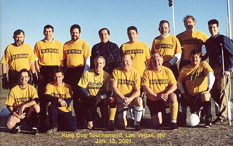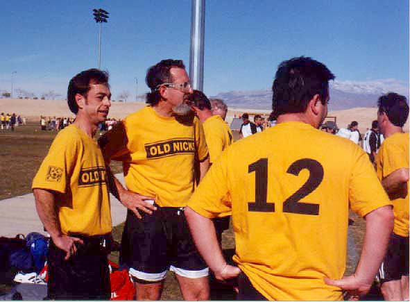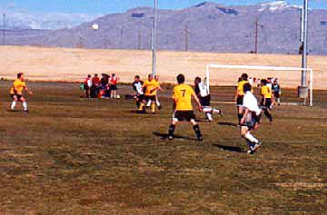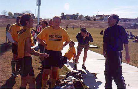 | At the airport, we actually lost Al for awhile, but we struggled on to our hotels, checked in, and began to wander the Strip in aimless groups. I knew I was truly in Vegas at the airport shuttle area where there was a 6'4", 300 lb driver with an Elvis haircut. The first game was ten miles north of town at the Buckskin athletic complex. Kickoff was at 7:30am. The sky was clear and there was a nice frosting of ice on the fields. Our first match was against Duke of Edinburgh, a team from the Bay Area which included, at our best count, at least three former NASL players including Chris Dangerfield who'd done a stint as a Portland Timber in 75-76. They were a gentlemanly group and demonstrated dozens of different ball skills and passing interactions which we had not seen that close up before. John Ripley, a player cajoled by Rob into joining us actually did get a couple of shots at the goal. We were heartened. Scoring a goal, we decided was our challenge for the trip. |