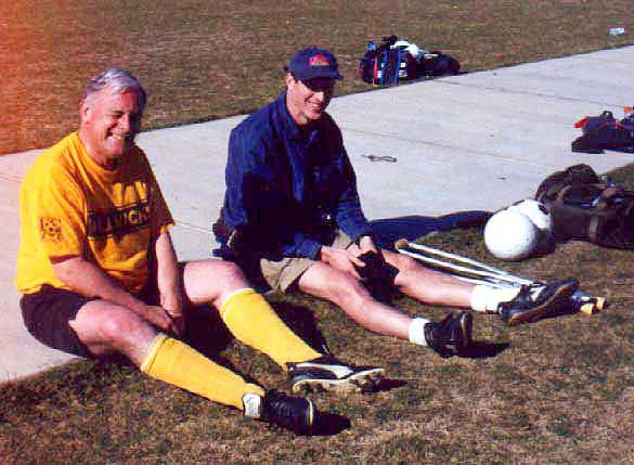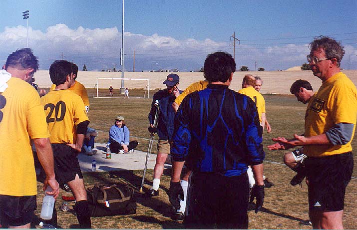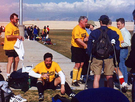 | The second game of the day was against Central Valley Sports, a team name not likely to strike fear iinto anyone's heart. However, we had lost yet another player- Jeff Welsh broke his toe. Despite the lack of subs, we played the game with heart. And again came close to scoring against a team that was still out of our league. But by the end of the match, we were both exhausted and glad to have survived the experience. The consensus was that it was a good experience and that we should come back next year and play in the Over 48 Recreation Division, or maybe use fake ID and look for an Over 55 group. | |